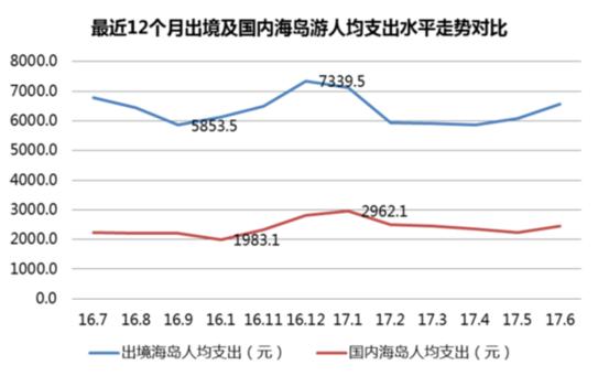 《报告》提供的同程旅游海岛游消费数据显示,最近一年(2016年7月至2017年6月)出境海岛游消费人群用于购买旅游产品(线路、交通、住宿等,不含购物消费)的人均支出为6340.6元,国内海岛游人均支出为2368.9元。从时间轴来看,出境海岛游和国内海岛游的人均支出水平明显与出游客流的季节呈现出同步变化趋势,出境海岛游旺季人均支出最高可达7339.5元,国内海岛游旺季人均支出最高可达2962.1元。