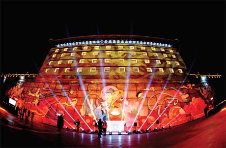 西安城墙新春灯会上被装饰一新的箭楼(2月8日摄)。2月8日晚,2018年西安城墙新春灯会在陕西西安明城墙开幕。“鱼化龙”“鸟语花香”“梦与飞翔”等万盏彩灯把古都装点得金碧辉煌。