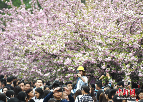 4月1日,中国科大校园樱花烂漫,万人涌入“樱花大道”。当日,安徽省合肥市中国科学技术大学校园内的樱花全面盛开,吸引民众游玩赏景。中新社记者 韩苏原 摄