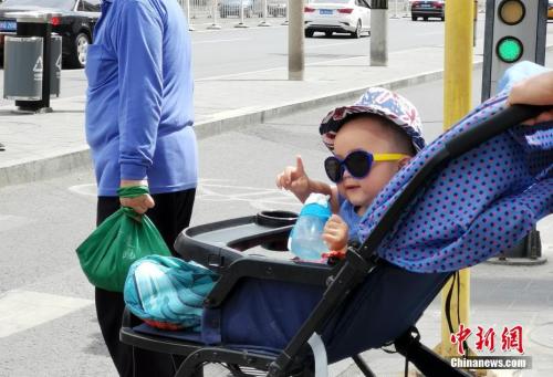 5月22日,北京街头一名孩子在婴儿车中戴着墨镜。中新社记者 杜洋 摄