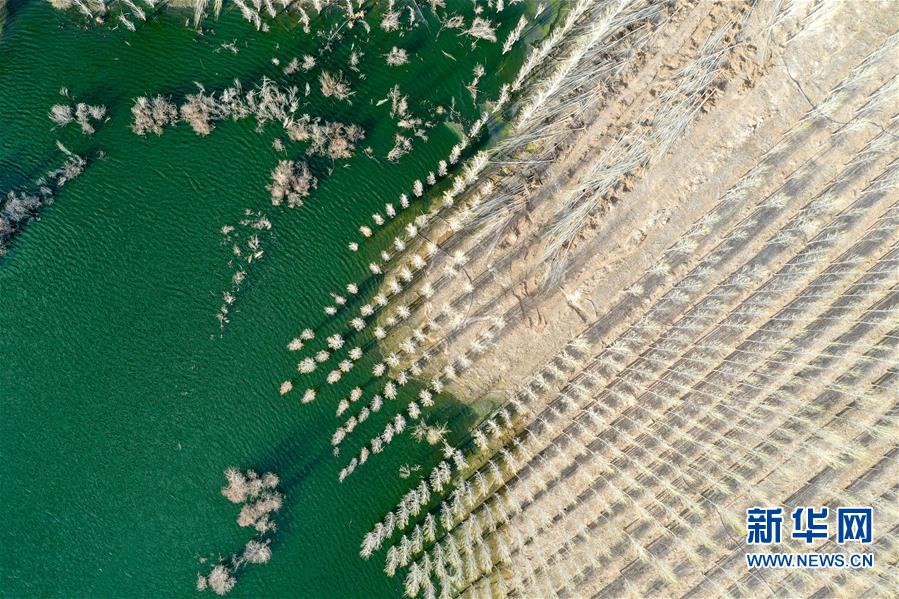 这是4月19日拍摄的阿勒泰市中水库一角(无人机照片)。近年来,新疆阿勒泰市利用经污水处理厂处理达标后的中水,灌溉建在戈壁滩上的苗圃基地,形成良性循环,助力绿化工程,改善生态环境。从2017年至今,阿勒泰市中水回用环境治理示范园已为当地绿化工程提供40万株树苗,实现5000亩荒山绿化。 新华社记者 丁磊 摄
