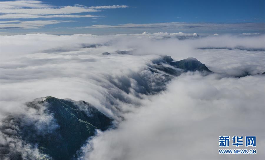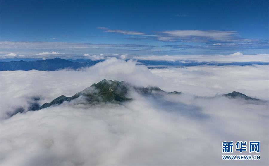 6月10日拍摄的汉中市南郑区龙头山主峰云海景观(无人机照片)。 新华社记者 陶明 摄