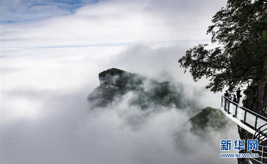 6月10日,游人在汉中市南郑区龙头山景区玻璃栈道上观赏云海。 新华社记者 陶明 摄