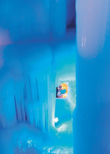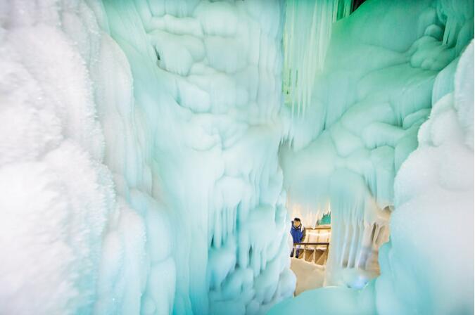 洞外鲜花盛开,绿树成荫,洞内却寒气逼人。目前,洞内已开发部分分为三层,有冰帘、冰钟、冰花、冰人、冰菩萨等,堪称一个冰的世界,在五彩灯光的照射下,呈现出梦幻般的景象,被称为世界奇观。