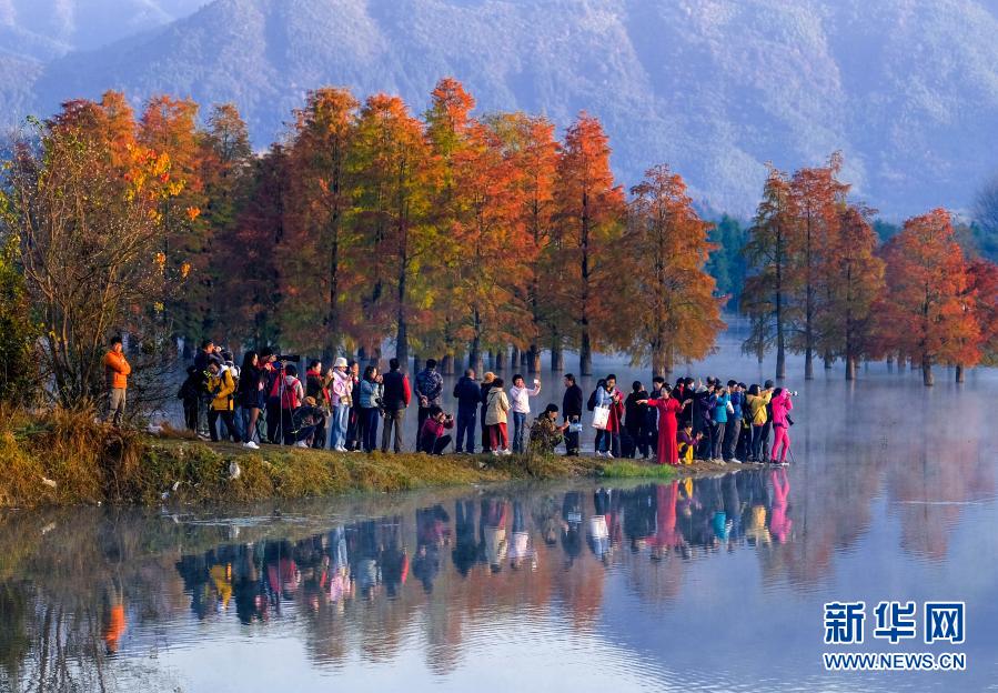 11月14日,安徽省黄山市黟县奇墅湖晨雾缥缈,美如仙境,吸引众多游客前来“打卡”。新华社发(水从泽摄)