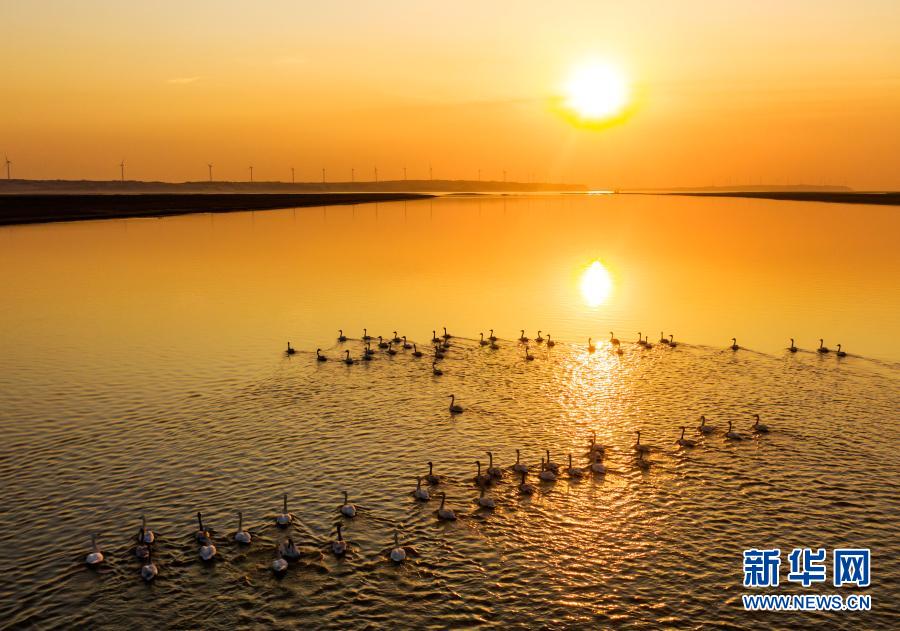 2月20日,在鄱阳湖都昌水域,小天鹅在夕阳下游弋(无人机照片)。