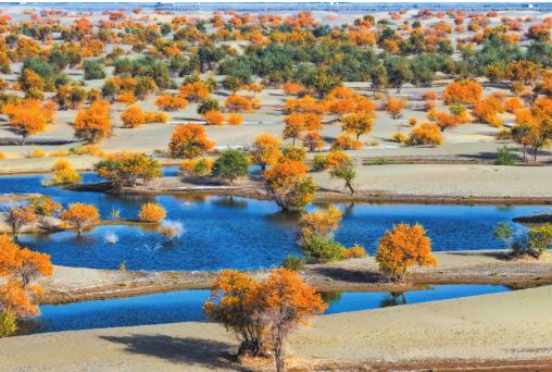 时下,新疆和田地区的胡杨迎来最佳观赏期,成片换妆的胡杨林与水天相映,共绘金秋美景。 新华社记者 辛悦卫 摄