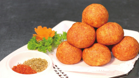 豆腐丸子精选五台山卤水豆腐,挤出多余水分,压成细腻豆腐碎,加入佐料搅拌,揉成圆润紧实的丸子,蒸制后在麦芽糖水中定型再开炸,外衣渐镀“金甲”,内里却保持着豆腐的柔嫩本味。
