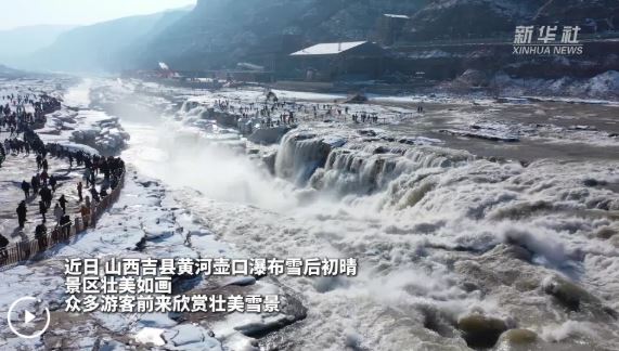 近日,山西吉县黄河壶口瀑布雪后初晴,景区壮美如画,众多游客前来欣赏壮美雪景。从空中俯瞰,瀑布仿佛披上了一层洁白的轻纱,黄河水夹杂着流凌从上游呼啸而下,跌入十里龙槽,激起阵阵白色水雾,经阳光折射后,一道美丽的彩虹若隐若现,美不胜收。