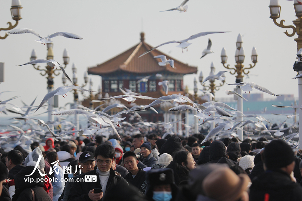 2026年1月30日,山东青岛栈桥景区,成群的海鸥在空中飞翔盘旋,吸引众多游客前来观赏互动,拍照留影。黄杰显摄(人民图片网)