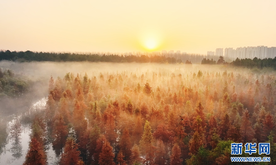 近日,在安徽省合肥市董铺水库,大片红杉林迎来最佳观赏期。从空中俯瞰,红色的树影倒映在绿水之上,让人陶醉。新华网发(江河 摄)