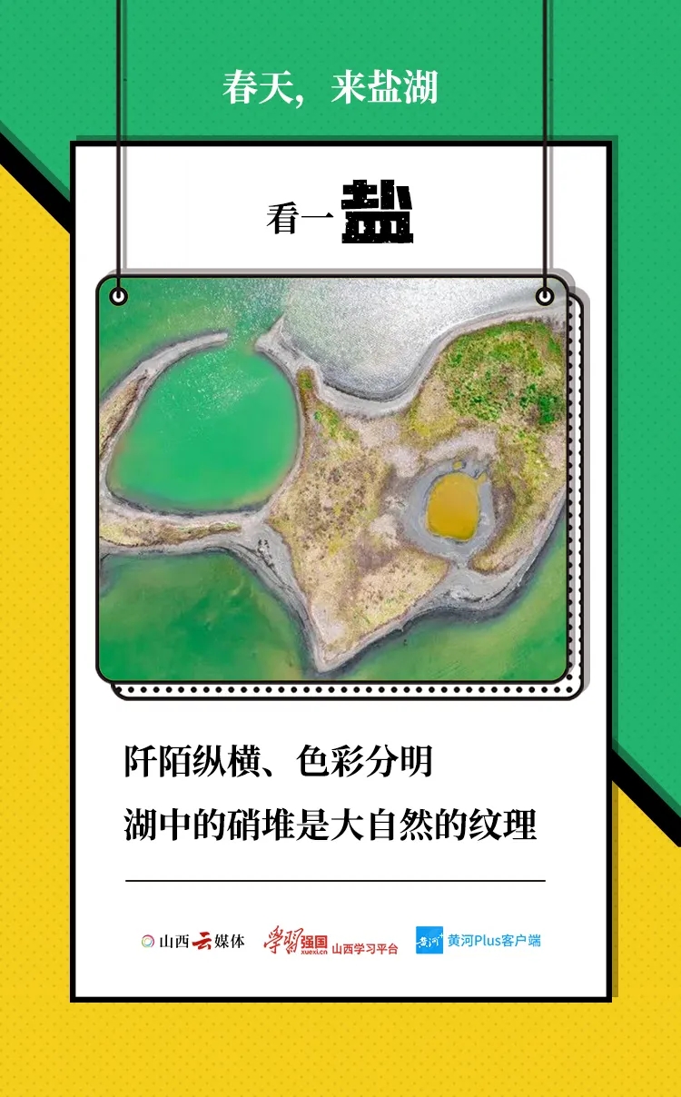 近日,随着气温不断升高,山西省运城市盐湖呈现出五彩斑斓的美丽景观。从空中俯瞰,盐湖宛若巨型大自然调色板,令人陶醉。漫步环湖步道,成群的飞鸟在湖面上嬉戏,发出阵阵鸣叫,中条山、蓝天白云倒映在湖面,与七彩盐湖交相辉映。