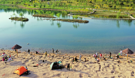 太原市西干渠,市民搭起帐篷喝茶吃烧烤,享受假日时光。