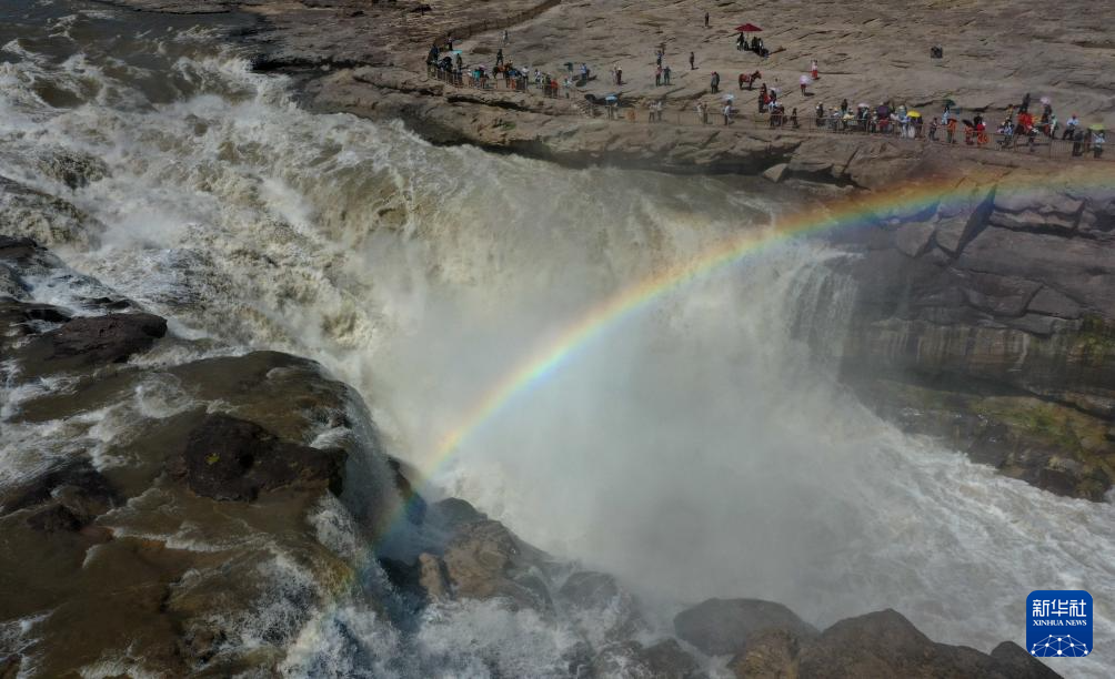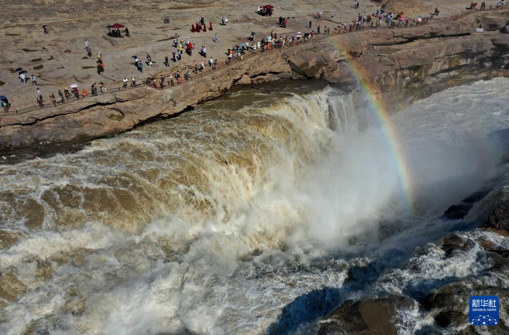 当日,受降雨影响,黄河壶口瀑布水量增大,河水翻滚而下,飞溅起的水雾在阳光的照射下,形成“彩桥通天”景观。