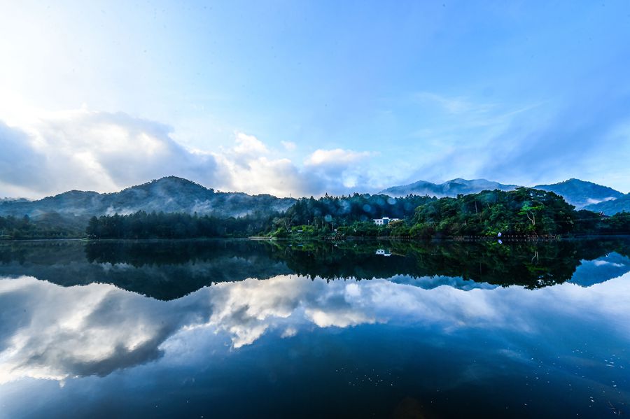 这是晨曦中的海南热带雨林国家公园尖峰岭和尖峰岭天池景色。