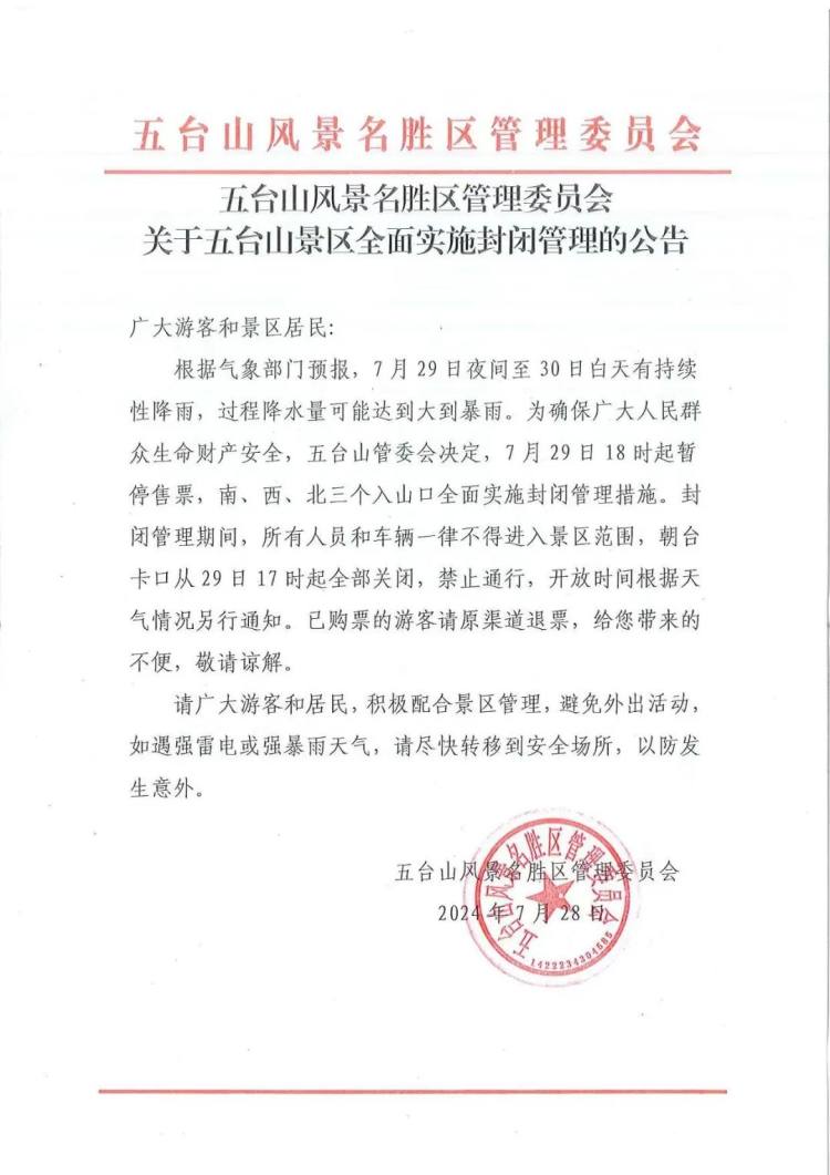 7月29日18时起五台山景区全面实施封闭管理