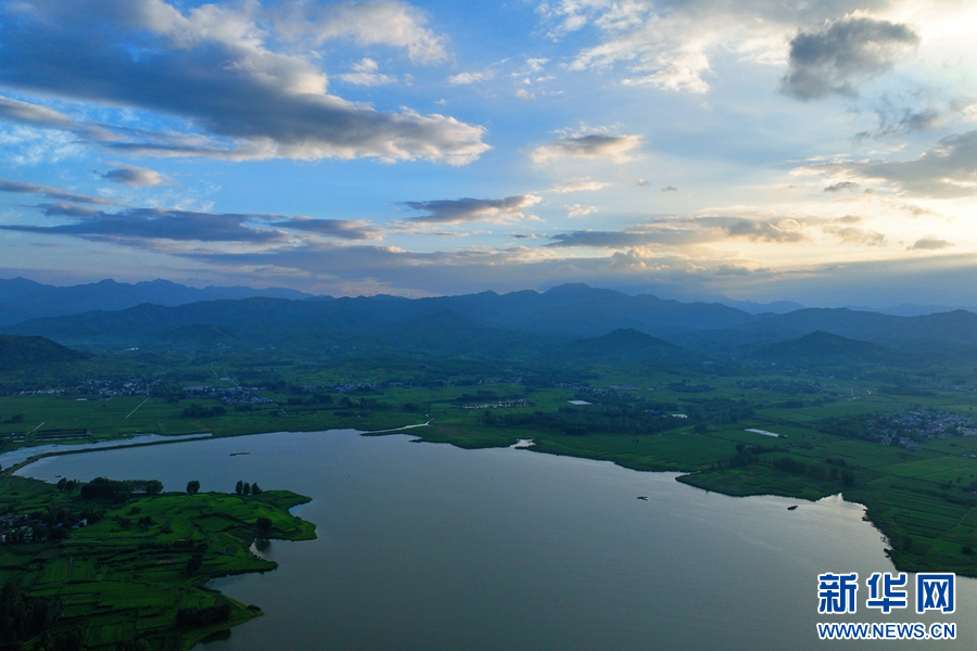 7月27日,河南省南阳市镇平县上空朝霞满天,天空、云朵、群山、水面在霞光的映衬下,宛若一个巨大的调色盘,美如画卷。新华网发(图文/时君洋)