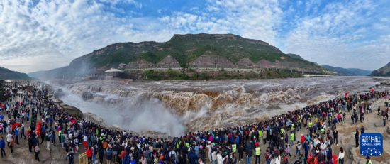 国庆长假期间,位于山西省吉县和陕西省宜川县交界处的黄河壶口瀑布迎来众多游客,观赏“黄河之水天上来”的壮观景象。