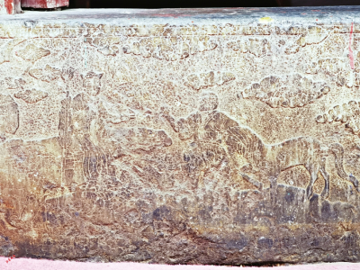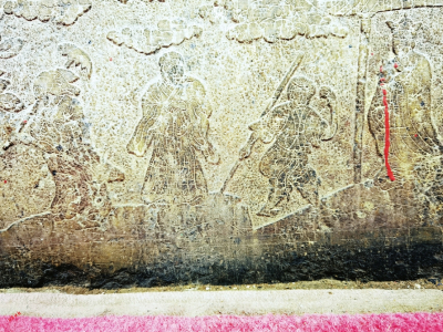 这是在泽州县金村镇显庆寺毗卢殿殿门长约3米的地伏上雕刻的“西游记”故事浮雕,端详四幅浮雕,观者有翻看连环画之感!