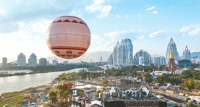 游客在云南省景洪市体验告庄西双景氦气球,领略西双版纳的迷人风光。