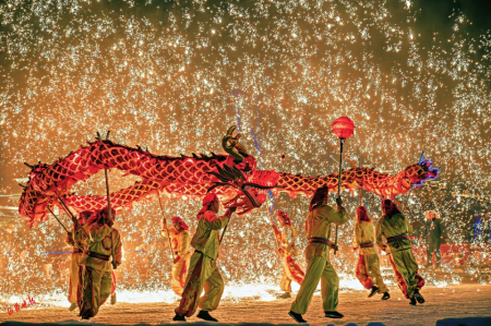 除了诱人的美食,精彩演艺必不可少。“新春巡游”的绚丽花车流光溢彩,演员们身着精致华丽的服饰载歌载舞,与游客热情互动。限定非遗“祈福花火秀”更是带来一场视觉盛宴,“铁树银花落,万点星辰开”,火龙钢花与落花秀相互交融,铁火流星漫天飞舞,一起感受跨越千年的祝福与炽热。还有“闹新春”主题晚会,歌舞、杂技轮番上演。广大游客还可在欢声笑语中围着篝火牵手狂欢,共度阖家团圆的美好时光。