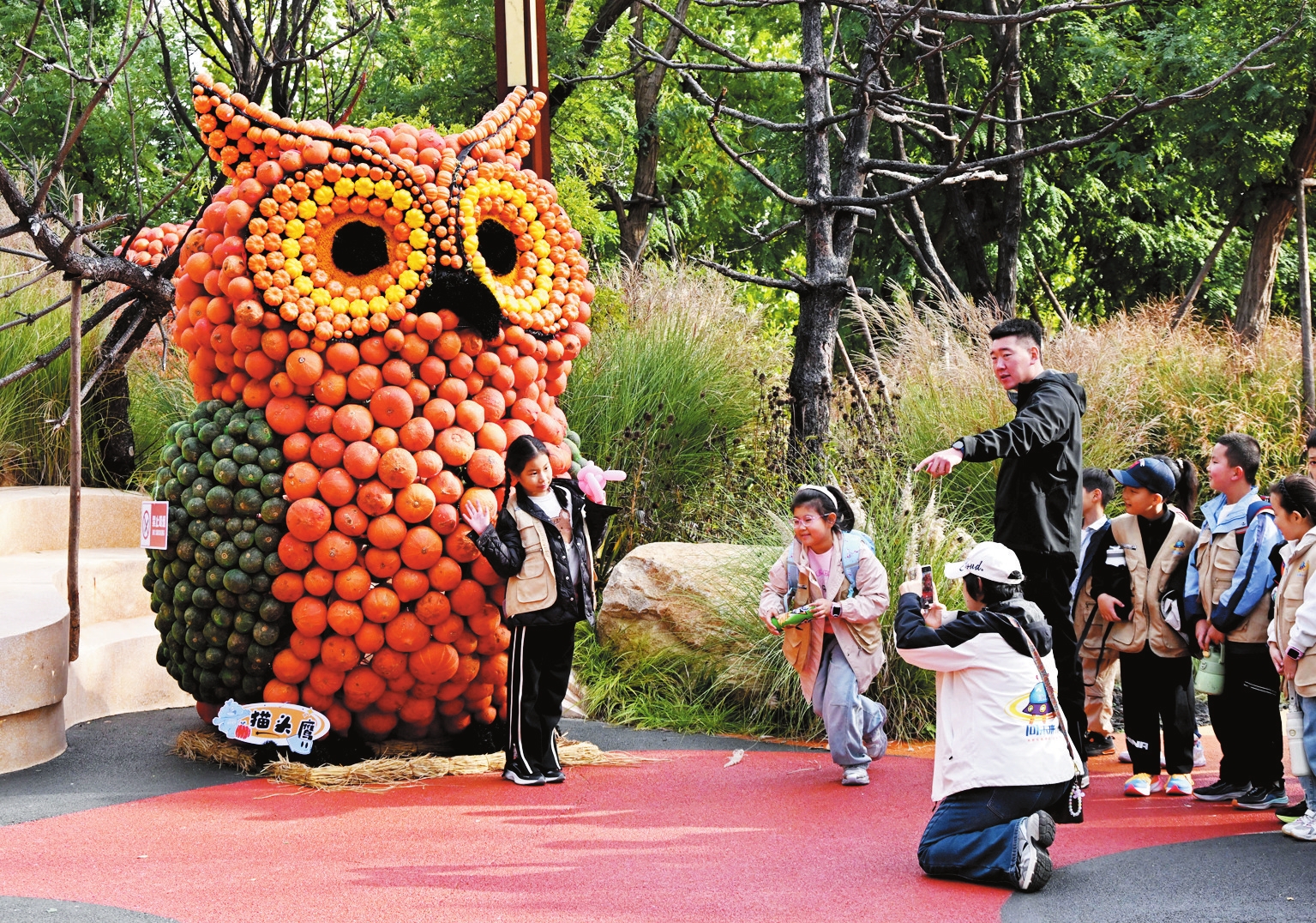 近日,青岛东方伊甸园举行“南瓜艺术王国”主题展。图为小朋友在排队与“南瓜猫头鹰”合影。 新华社记者 李紫恒 摄