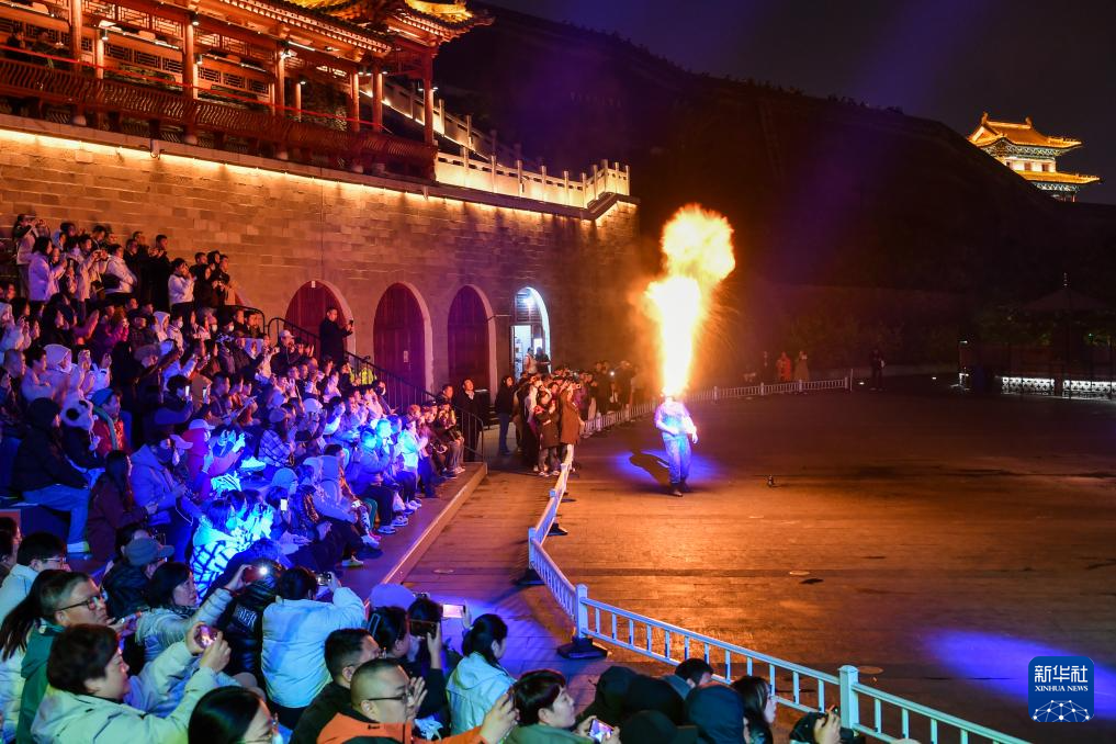 10月25日,游客在忻州古城观看表演。