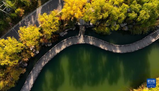 这是10月29日在银川市陈家湖畔拍摄的秋景(无人机照片)。