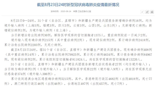人民网北京8月24日电(董童)国家卫生健康委于今日在官网发布的《截至8月23日24时新型冠状病毒肺炎疫情最新情况》(以下简称“情况”)提出,8月23日0—24时,31个省(自治区、直辖市)和新疆生产建设兵团报告新增确诊病例16例,均为境外输入病例(上海5例,福建3例,四川3例,云南3例,山西1例,山东1例);无新增死亡病例;新增疑似病例1例,为境外输入病例(在上海)。当日新增治愈出院病例30例,解除医学观察的密切接触者1375人,重症病例较前一日减少2例。
