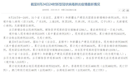 人民网北京8月25日电(董童)国家卫生健康委于今日在官网发布的《截至8月24日24时新型冠状病毒肺炎疫情最新情况》(以下简称“情况”)提出,8月24日0—24时,31个省(自治区、直辖市)和新疆生产建设兵团报告新增确诊病例14例,均为境外输入病例(四川4例,广东3例,上海2例,陕西2例,天津1例,河北1例,辽宁1例);无新增死亡病例;无新增疑似病例。当日新增治愈出院病例36例,解除医学观察的密切接触者1294人,重症病例较前一日减少4例。