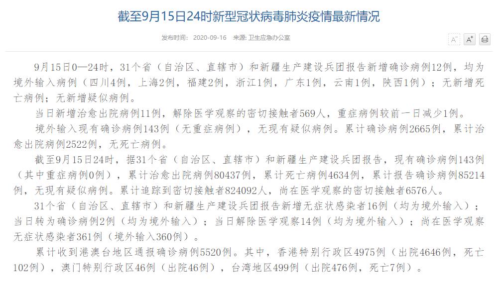 人民网北京9月16日电(董童)国家卫生健康委于今日在官网发布的《截至9月15日24时新型冠状病毒肺炎疫情最新情况》(以下简称“情况”)提出,9月15日0—24时,31个省(自治区、直辖市)和新疆生产建设兵团报告新增确诊病例12例,均为境外输入病例(四川4例,上海2例,福建2例,浙江1例,广东1例,云南1例,陕西1例);无新增死亡病例;无新增疑似病例。当日新增治愈出院病例11例,解除医学观察的密切接触者569人,重症病例较前一日减少1例。