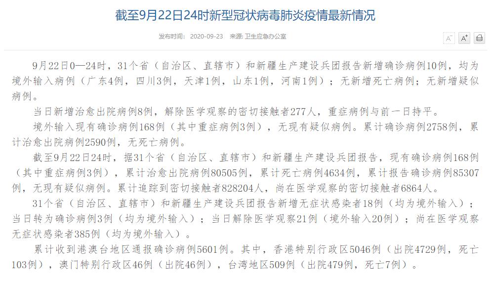 人民网北京9月23日电(董童)国家卫生健康委于今日在官网发布的《截至9月22日24时新型冠状病毒肺炎疫情最新情况》(以下简称“情况”)提出,9月22日0—24时,31个省(自治区、直辖市)和新疆生产建设兵团报告新增确诊病例10例,均为境外输入病例(广东4例,四川3例,天津1例,山东1例,河南1例);无新增死亡病例;无新增疑似病例。当日新增治愈出院病例8例,解除医学观察的密切接触者277人,重症病例与前一日持平。