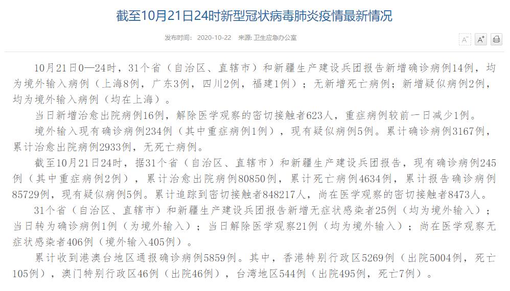 人民网北京10月22日电(董童)国家卫生健康委于今日在官网发布的《截至10月21日24时新型冠状病毒肺炎疫情最新情况》(以下简称“情况”)提出,10月21日0—24时,31个省(自治区、直辖市)和新疆生产建设兵团报告新增确诊病例14例,均为境外输入病例(上海8例,广东3例,四川2例,福建1例);无新增死亡病例;新增疑似病例2例,均为境外输入病例(均在上海)。当日新增治愈出院病例16例,解除医学观察的密切接触者623人,重症病例较前一日减少1例。