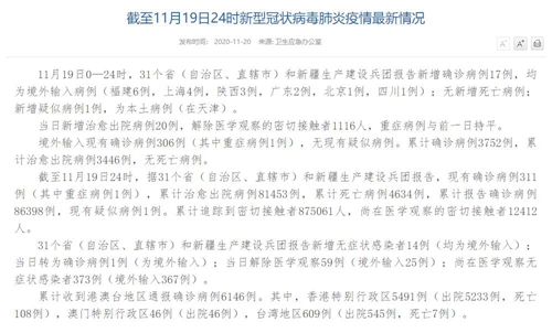 人民网北京11月20日电(董童)国家卫生健康委于今日在官网发布的《截至11月19日24时新型冠状病毒肺炎疫情最新情况》(以下简称“情况”)提出,11月19日0—24时,31个省(自治区、直辖市)和新疆生产建设兵团报告新增确诊病例17例,均为境外输入病例(福建6例,上海4例,陕西3例,广东2例,北京1例,四川1例);无新增死亡病例;新增疑似病例1例,为本土病例(在天津)。当日新增治愈出院病例20例,解除医学观察的密切接触者1116人,重症病例与前一日持平。