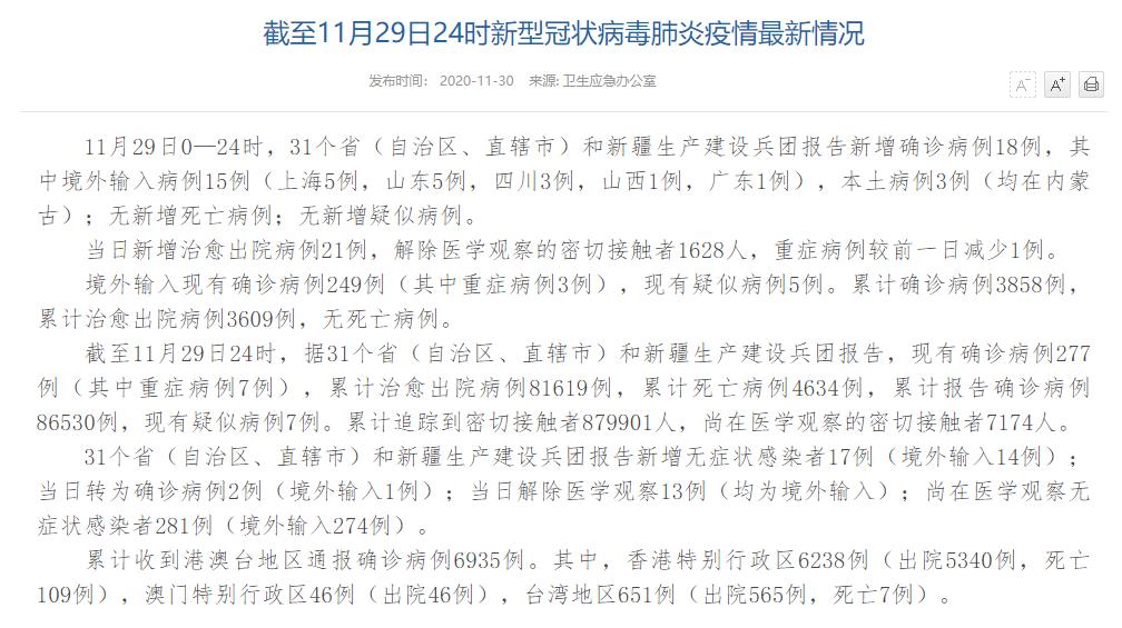 人民网北京11月30日电(董童)国家卫生健康委于今日在官网发布的《截至11月29日24时新型冠状病毒肺炎疫情最新情况》(以下简称“情况”)指出,11月29日0—24时,31个省(自治区、直辖市)和新疆生产建设兵团报告新增确诊病例18例,其中境外输入病例15例(上海5例,山东5例,四川3例,山西1例,广东1例),本土病例3例(均在内蒙古);无新增死亡病例;无新增疑似病例。当日新增治愈出院病例21例,解除医学观察的密切接触者1628人,重症病例较前一日减少1例。