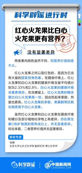 中新网10月16日电 在膳食纤维上,白心火龙果的膳食纤维含量更高些;在含糖量上,红心火龙果的糖含量比白心火龙果高一些,热量也更高;红心火龙果的多酚、类黄酮等抗氧化物质高于白心火龙果。二者在维生素C和矿物质的营养成分上,并无显著差异。综合来看,二者营养价值相差不大。(来源:@科学辟谣 @中国新闻网 )