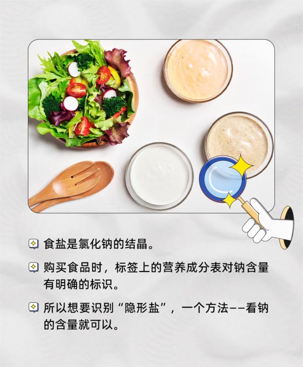 日常饮食要控盐。有些食品尝起来并不咸,但含盐量却相当高,因为含有不少“隐形盐”。食盐是氯化钠的结晶,购买食品时,标签上的营养成分表对钠含量有明确的标识。所以想要识别“隐形盐”,可以看标签上钠的含量。(来源:科普中国)