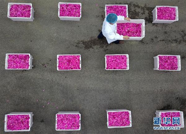 2018年4月21日,在贵州省镇远县青溪镇一家以鲜花为原料酿酒的企业,工人在搬运玫瑰花(无人机拍摄)。新华社发(蔡兴文 摄)
