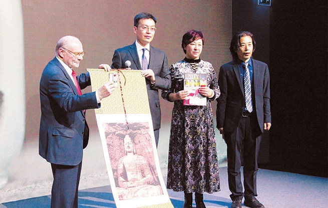 阿兰·蓬皮杜先生接受大同市赠送非物质文化遗产作品。本报通讯员摄