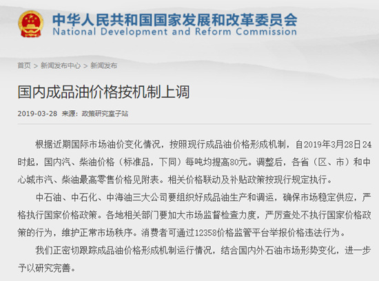 人民网北京3月28日电 (王绍绍) 国家发改委刚刚发布通知, 根据近期国际市场油价变化情况,按照现行成品油价格形成机制,自2019年3月28日24时起,国内汽、柴油价格(标准品,下同)每吨均提高80元。调整后,各省(区、市)和中心城市汽、柴油最高零售价格见附表。相关价格联动及补贴政策按现行规定执行。
