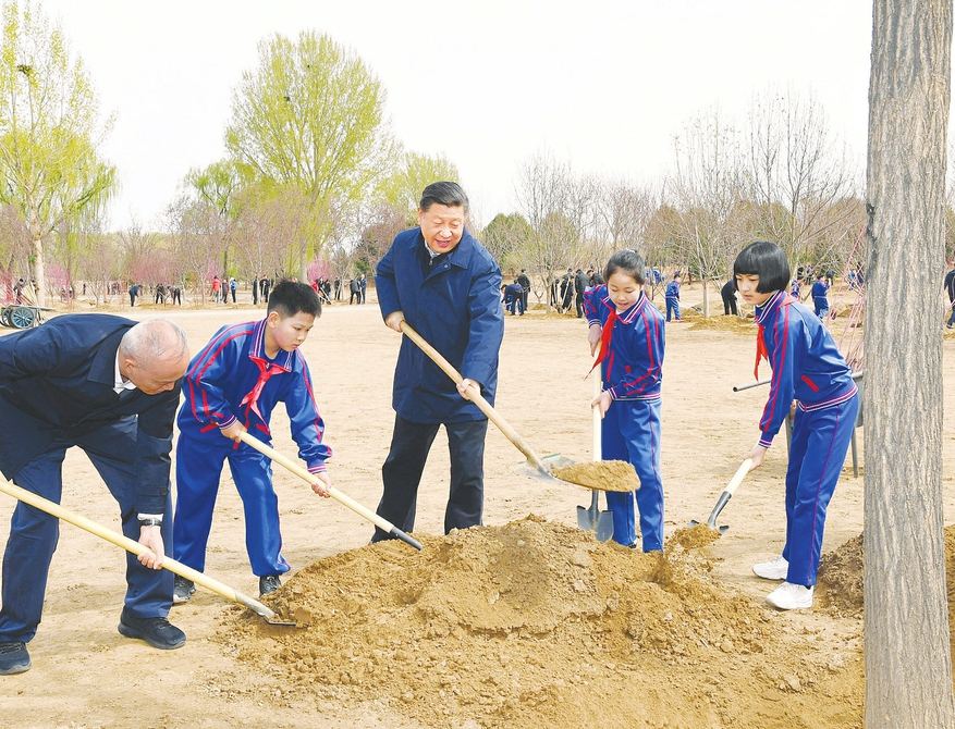 油松、国槐、侧柏、玉兰、红瑞木、碧桃……习近平接连种下7棵树苗。他一边劳动,一边向身边的少先队员询问学习生活和体育锻炼情况,叮嘱他们从小养成爱护自然、保护环境的意识,用自己的双手把祖国建设得更加美丽,祝他们像小树苗一样茁壮成长。