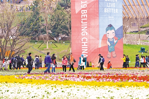 4月20日,世园会进行全负荷压力测试,参观者在园区内游览。(北京世园局供图)
