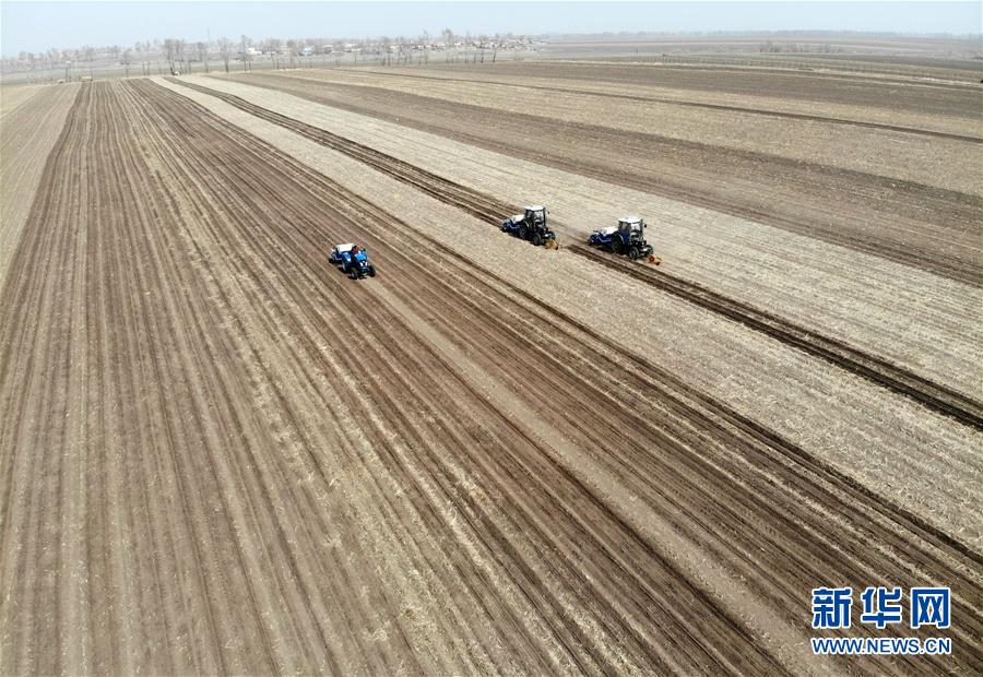 4月23日无人机拍摄的吉林省榆树市弓棚镇农民在进行春耕生产。新华社记者 林宏 摄