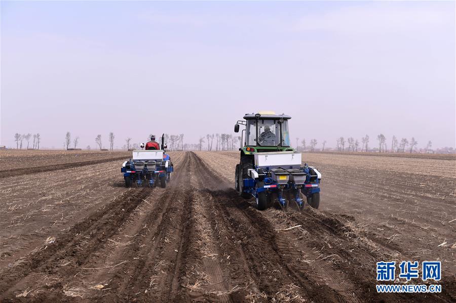 4月23日,吉林省榆树市弓棚镇农民在播种玉米。 新华社记者 林宏 摄
