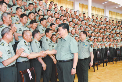 5月21日,中共中央总书记、国家主席、中央军委主席习近平到陆军步兵学院视察。这是习近平亲切接见驻江西部队副师职以上领导干部和建制团级单位主官、陆军步兵学院本部正团职以上干部和石家庄校区主官、专家教授代表。新华社记者 李 刚摄