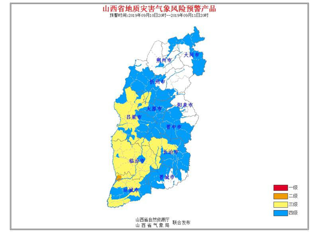 9月10日17时23分,山西省自然资源厅和山西省气象局联合发布地质灾害气象风险预警: