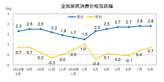 人民网北京9月10日电 (杨曦)国家统计局今日公布数据显示,2019年8月份,全国居民消费价格(CPI)同比上涨2.8%,与上月持平;8月份CPI环比上涨0.7%,涨幅略有扩大。1——8月平均,CPI同比上涨2.4%。