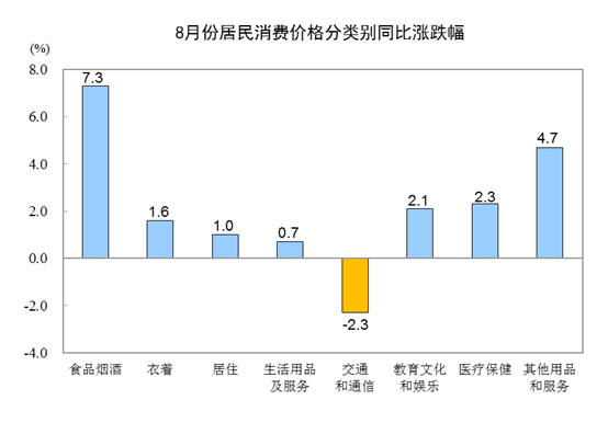 国家统计局城市司高级统计师沈赟分析,食品价格影响CPI上涨约0.64个百分点,非食品影响CPI上涨约0.07个百分点。食品中,猪肉供应偏紧,价格上涨23.1%,涨幅比上月扩大15.3个百分点,影响CPI上涨约0.62个百分点。受中秋节临近和消费替代影响,鸡蛋、牛肉、羊肉、鸡肉和鸭肉价格上涨2.0%—5.9%,合计影响CPI上涨约0.10个百分点。受台风及高温天气影响,鲜菜价格上涨2.8%,影响CPI上涨约0.07个百分点。时令瓜果大量上市,鲜果价格下降10.1%,影响CPI下降约0.22个百分点。非食品中,旅馆住宿、飞机票和旅行社收费价格分别上涨1.6%、0.8%和0.3%;汽油和柴油价格分别下降1.1%和1.2%。