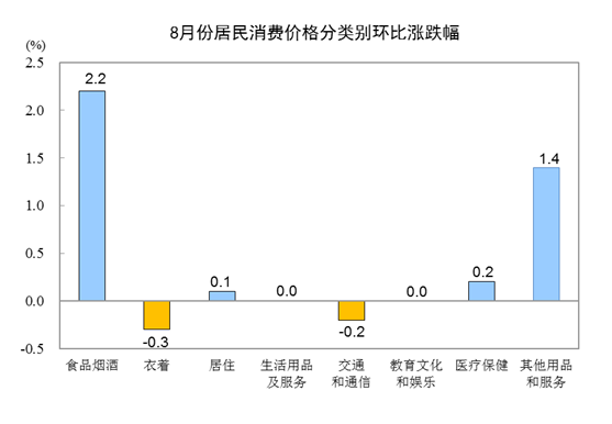 8月份,CPI环比上涨0.7%,涨幅比上月扩大0.3个百分点。其中,城市上涨0.6%,农村上涨1.0%;食品价格上涨3.2%,非食品价格上涨0.1%;消费品价格上涨1.1%,服务价格上涨0.2%。
