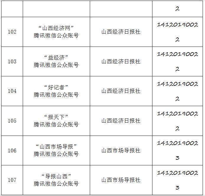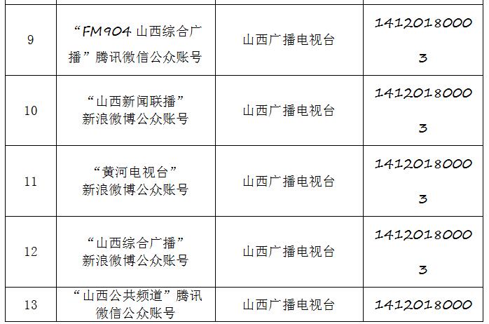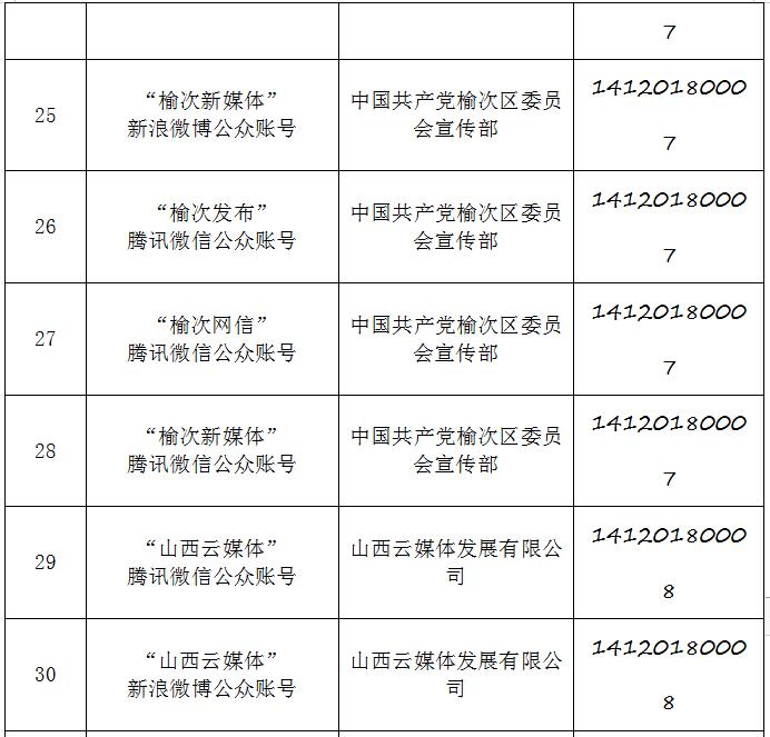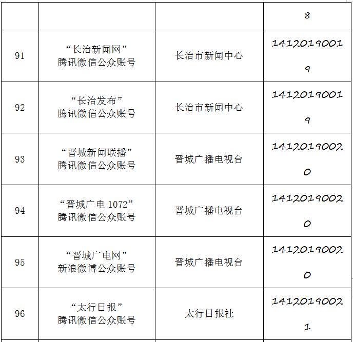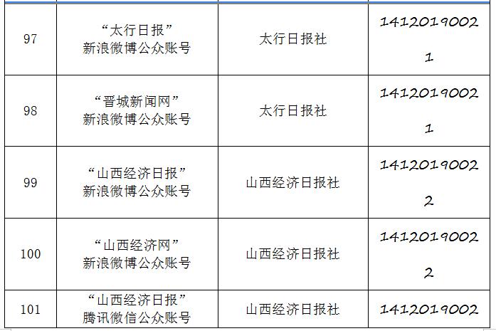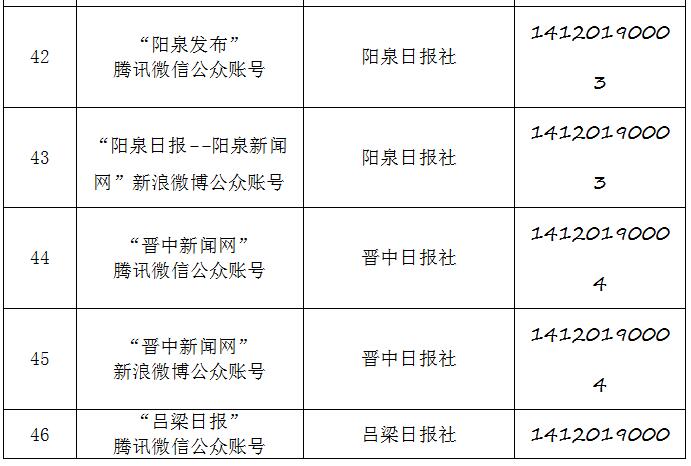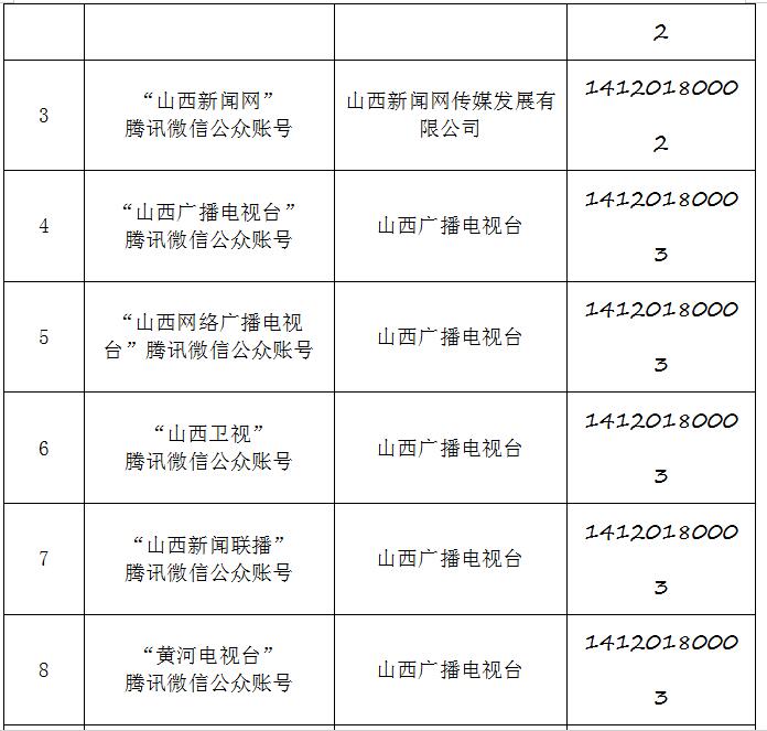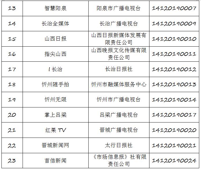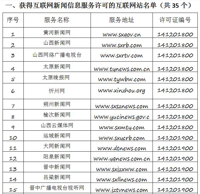 截至2019年9月20日,经山西省互联网信息办公室许可的属地互联网新闻信息服务单位共计34家,具体服务形式包括:互联网站35个,应用程序23个,论坛1个,公众账号130,共计189个服务项。